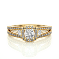 The centerpiece of this ring is a dazzling round diamond, carefully cradled within a secure and timeless claw prong setting with a halo around it. Flanking the center diamond on either side are two smaller round diamonds, gracefully nestled in their own individual settings. These diamonds, create a harmonious trio that symbolizes the past, present, and future of your story. Adding to the allure of this ring is the intricate pave setting on the split shank band.