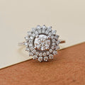 Ring showcases a brilliant round diamond at its center, encircled by not one, but two dazzling halos of smaller diamonds. The result is a scintillating display of light and luxury that captures every gaze. Crafted with the utmost precision and adorned with the finest diamonds, this ring is a testament to enduring beauty. Wear it as a symbol of your timeless love and unending style.